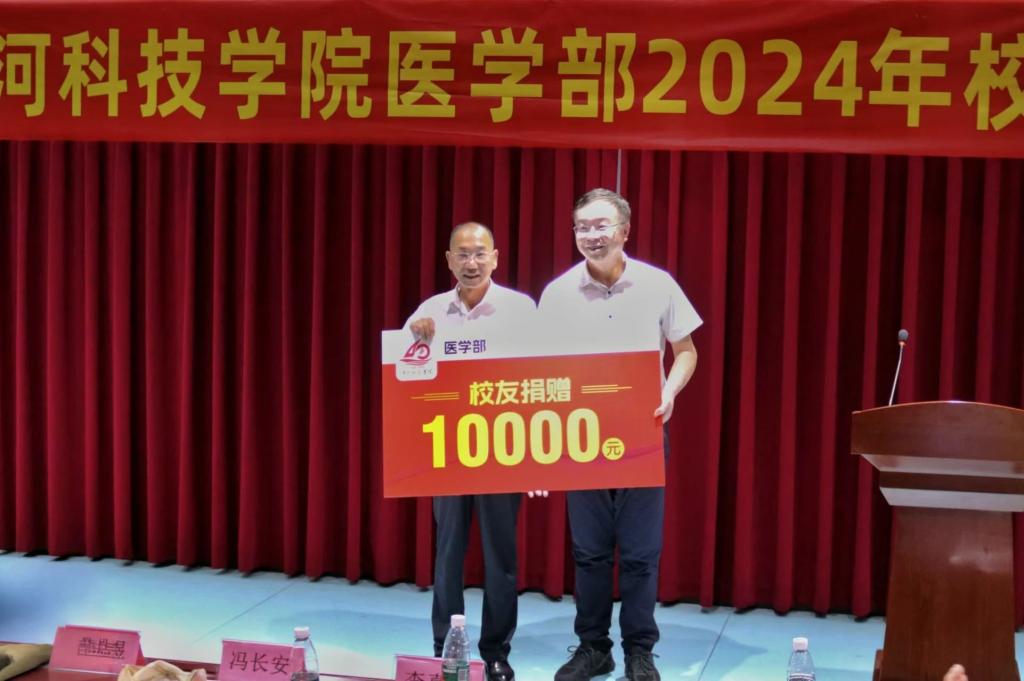 校友代表共捐赠款物165万余元,其中1999级中西医结合专业校友祁西涛与邵春霞夫妇捐赠款物125万元,1993级中西医临床专业校友范金平捐赠款物30万元,1988级五官专业校友常亮捐赠款物1万元,1999级中西医班级代表捐赠款物8.8万元,还有一些校友通过不同途径对学校进行了捐赠,广州校友会会长、91级校友陈春生校友捐赠12000元。冯长安、罗煜、李喜强、张光辉代表学校接受捐赠。