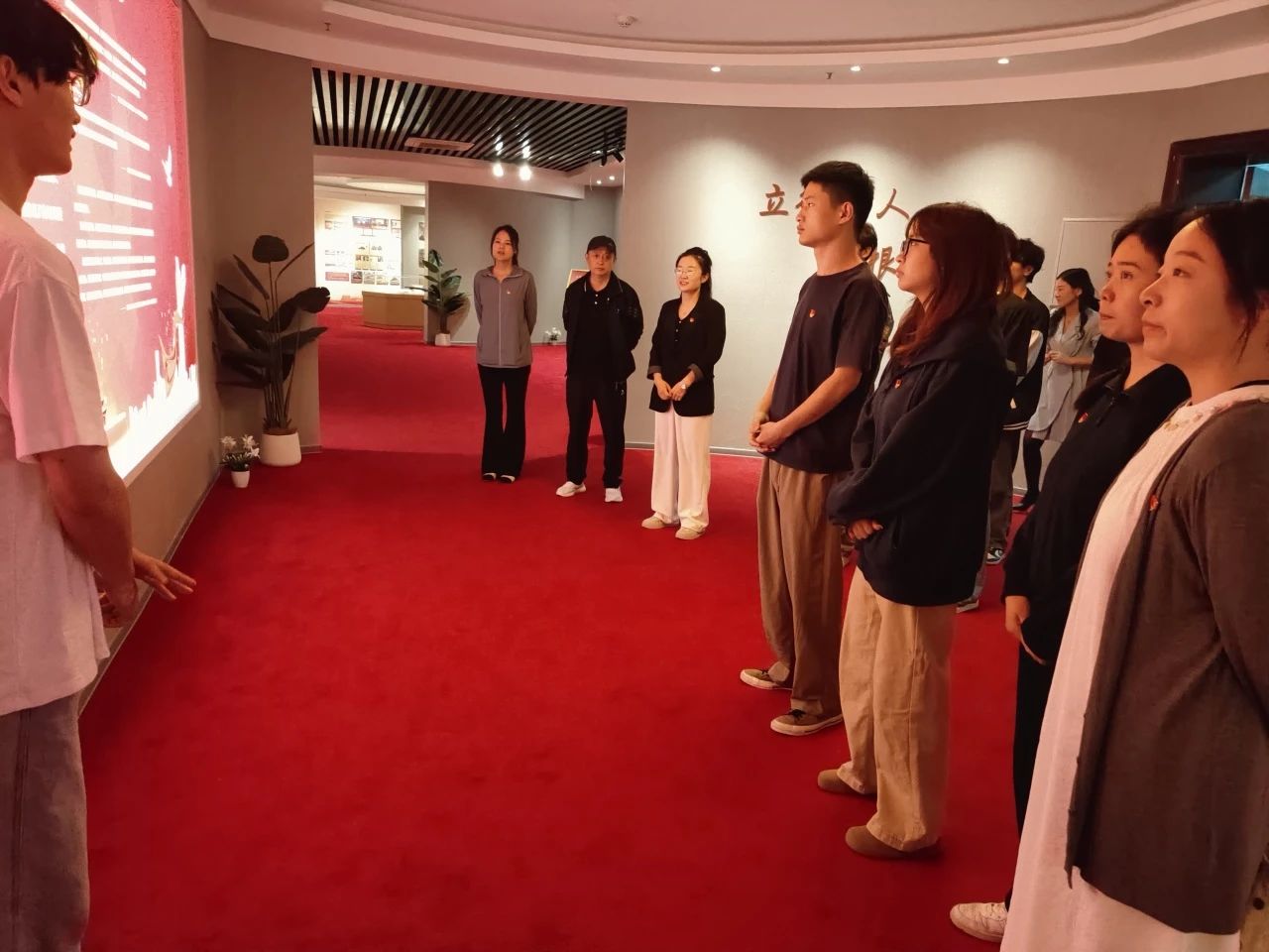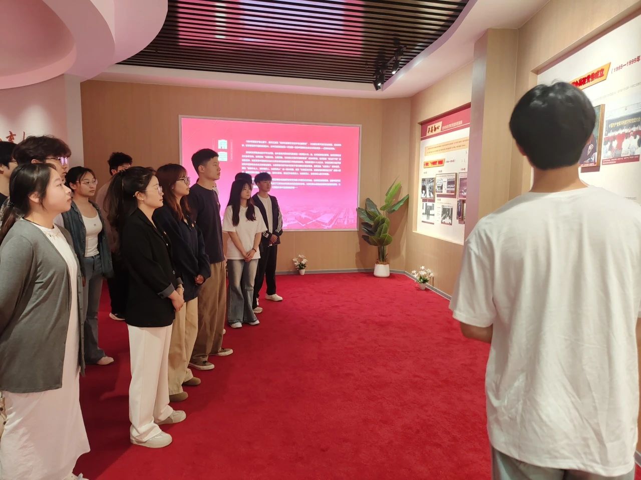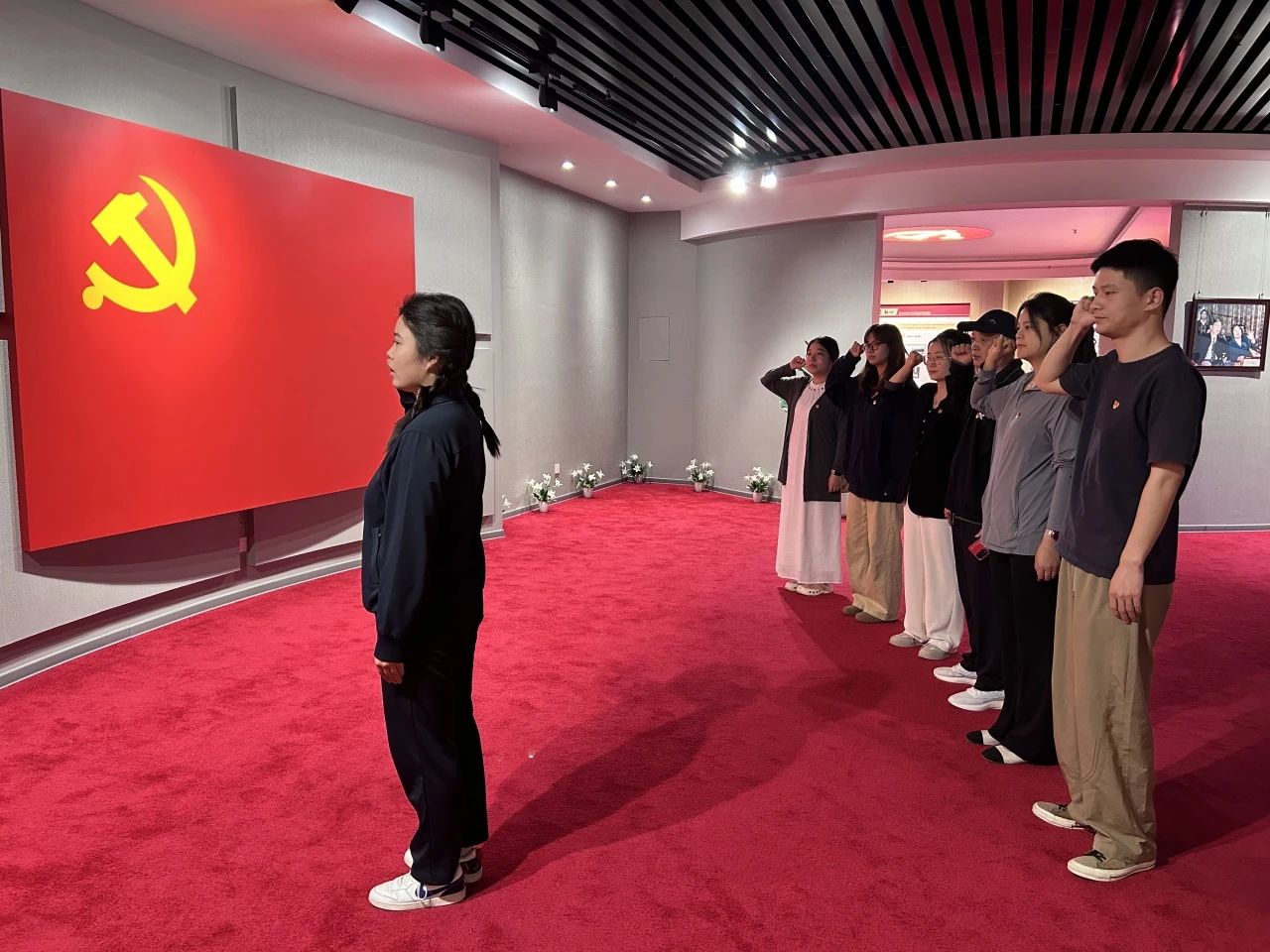 踏入党史馆,同学们在讲解员的引导下开启学习之旅。讲解员以熟练流畅的语言,结合馆内陈列的历史文物、图文展板,将学校党建发展历程娓娓道来。跟随讲解员的脚步,党员们聆听着学校创办初期十年四处奔波“找党”的故事,深刻感受到学校坚定不移跟党走的信念与决心。参观完实体展区后,党员们移步至党史馆多媒体展厅,围坐在屏幕前观看精心制作的校史专题视频。视频通过珍贵影像与纪实画面,立体呈现了学校自创办以来的风雨征程。而馆内陈列的百余张珍贵照片,更让党员们直观领略到学校翻天覆地的变化与蓬勃发展的生机。最后,在党史馆鲜红的党旗前,党员代表刘明月作为领誓人,带领全体党员举起右拳,齐声重温入党誓词。铿锵有力的誓言在馆内久久回荡,激荡着每一位党员的初心与使命。