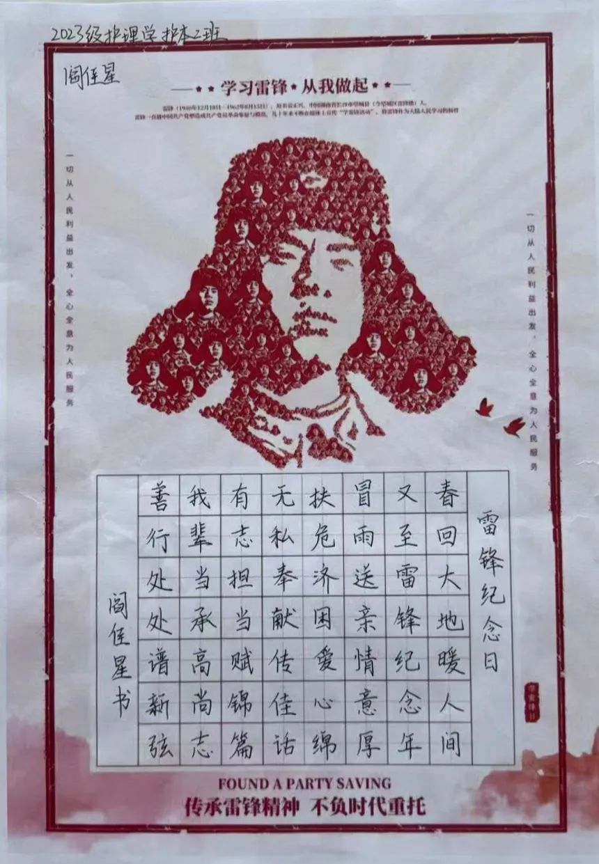 三月春风暖人心,雷锋精神永传承。为大力弘扬雷锋精神,传播“奉献、友爱、互助、进步”的志愿理念,推动社会主义精神文明建设,古天乐太阳集团城团委举办“传承雷锋精神,书画传递爱心”书画展活动。古天乐太阳集团城学子积极响应,以笔为媒、以心为绘,勾勒出鲜活的雷锋记忆,用艺术语言再现雷锋故事里的星火微光,彰显出新时代青年的担当与信念。