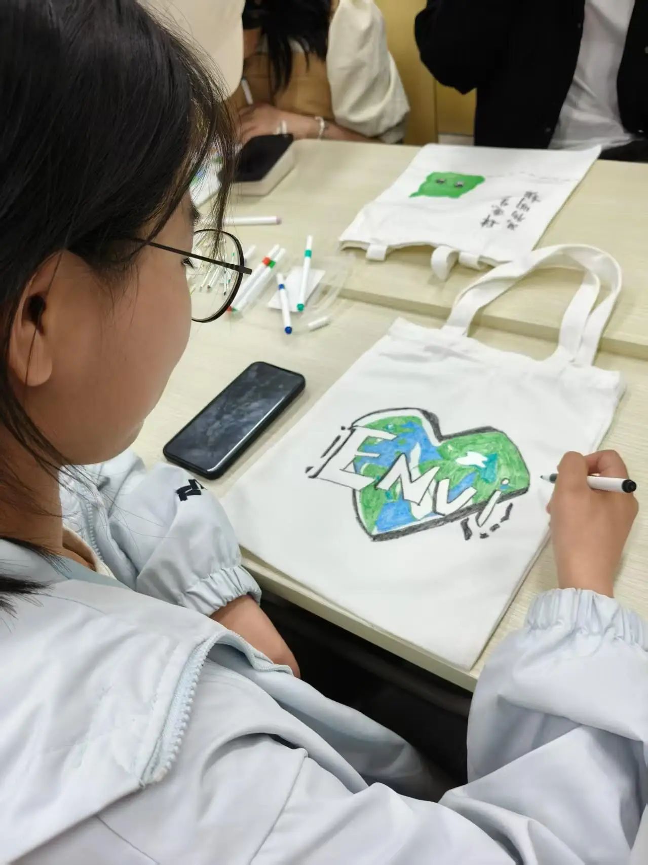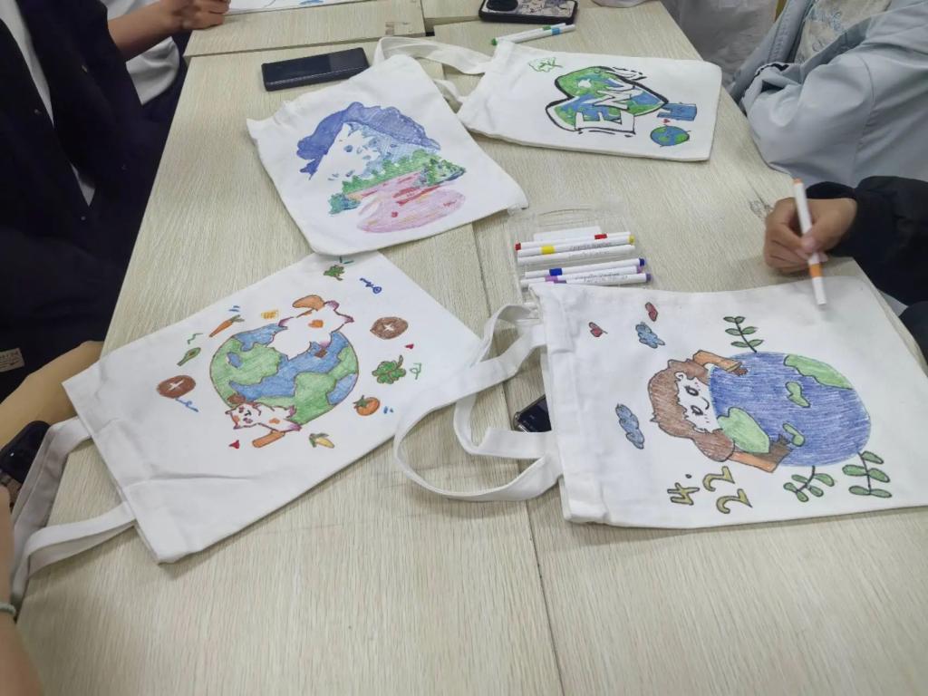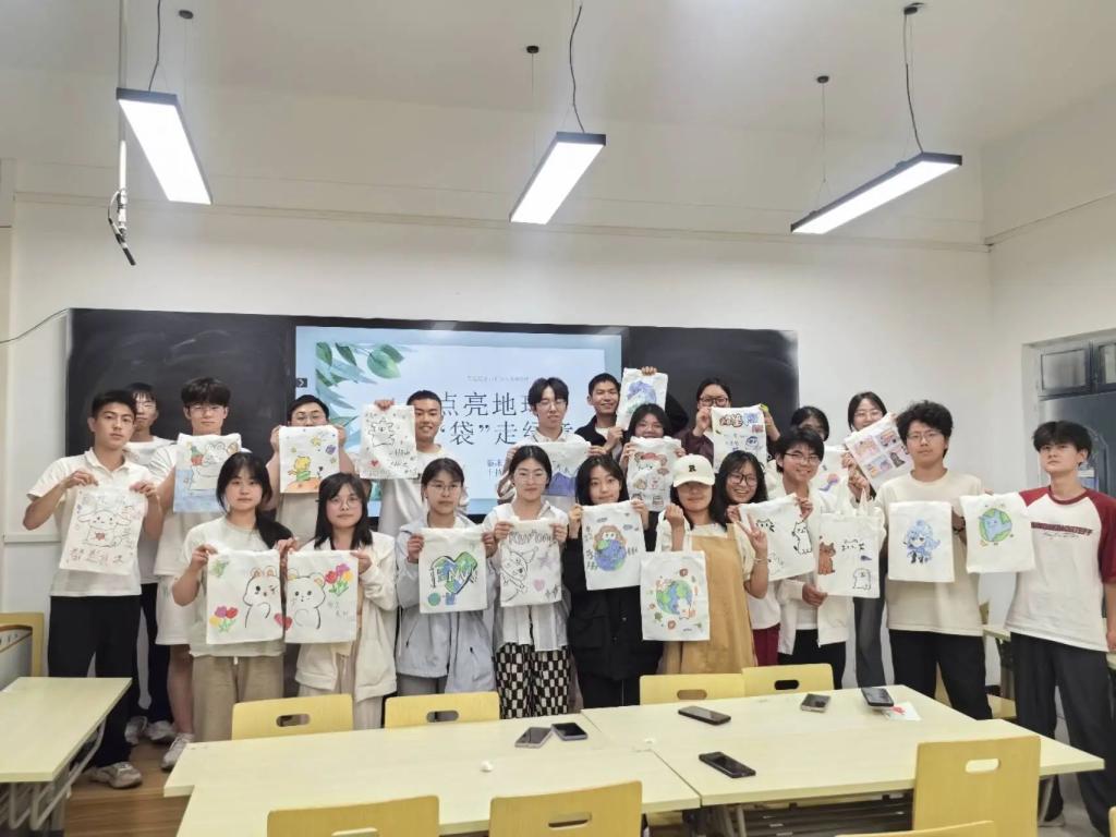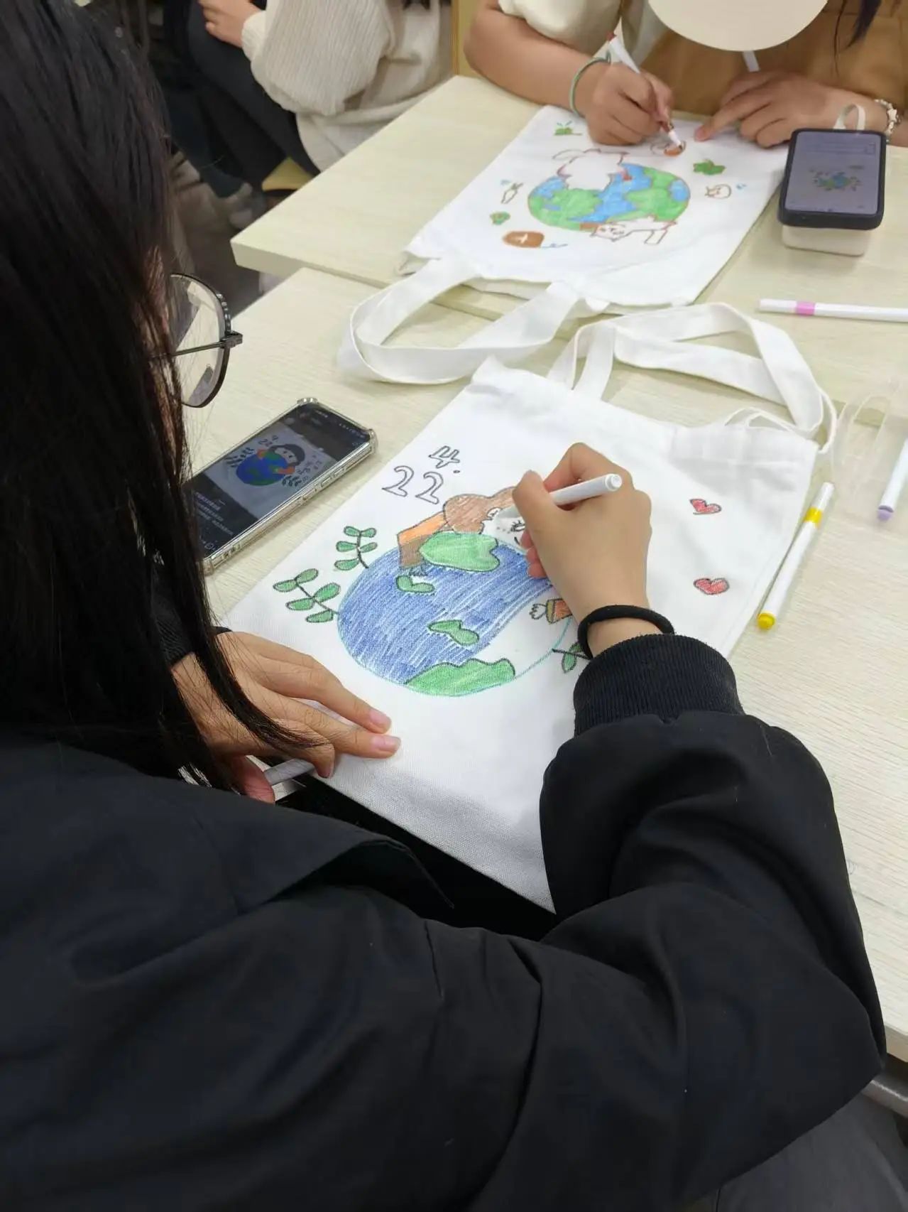 会上,周昱彤通过一段生动的环保视频引入主题,直观展现了废旧物品的再利用价值,呼吁队员从日常小事践行环保。随后,队员们领取白色亚麻布袋与马克笔,分组展开创意手绘。参与者们或勾勒自然风光,或描绘卡通形象,巧妙搭配纽扣、丝带等饰品,将素色布袋化为风格各异的“艺术品”。活动现场欢声笑语,既有清新简约的设计,也不乏活泼灵动的巧思,充分展现了青年一代的创造力与环保热情。接着,手绘环节结束后,队员们逐一登台展示作品,分享设计灵感与环保感悟。周昱彤在总结发言中强调:“环保不是口号,而是举手之间的选择。一只布袋的循环使用,一次垃圾分类的坚持,都能为地球减负。”她鼓励全体队员将绿色理念融入生活,从减少一次性用品、参与校园清洁等小事做起,共同营造绿色校园与社会。最后,全体成员合影留念,记录这一意义非凡的环保实践时刻。