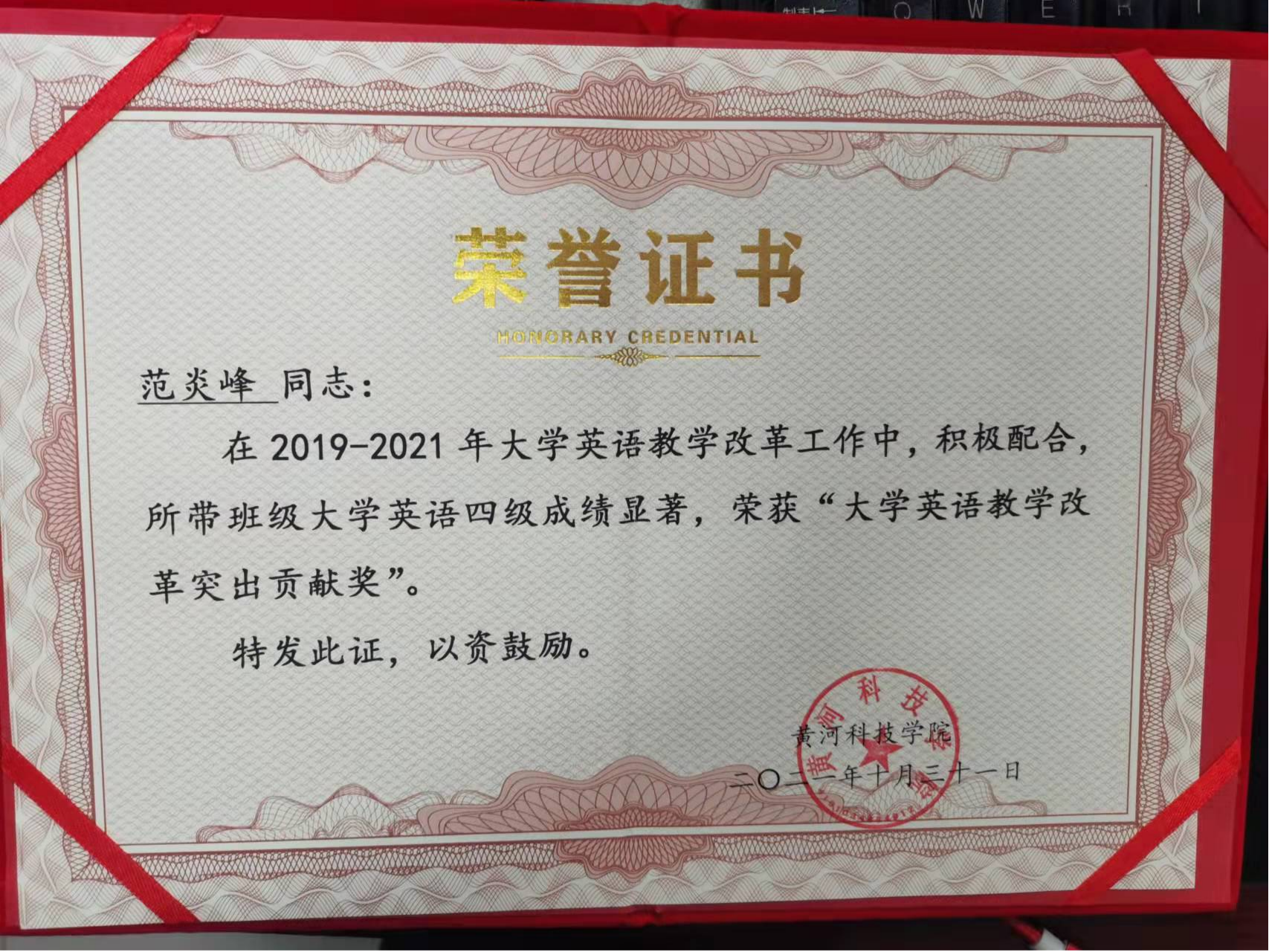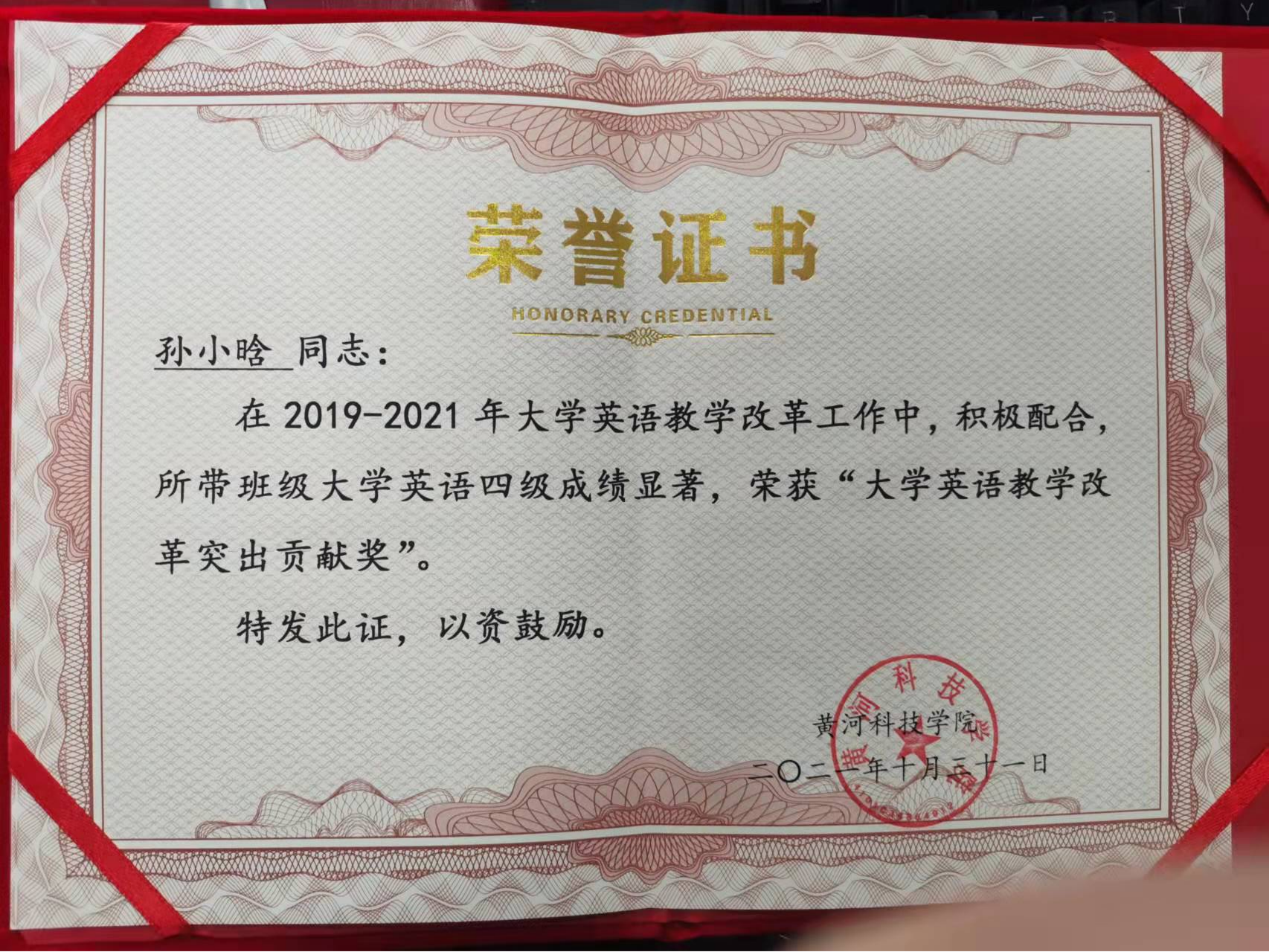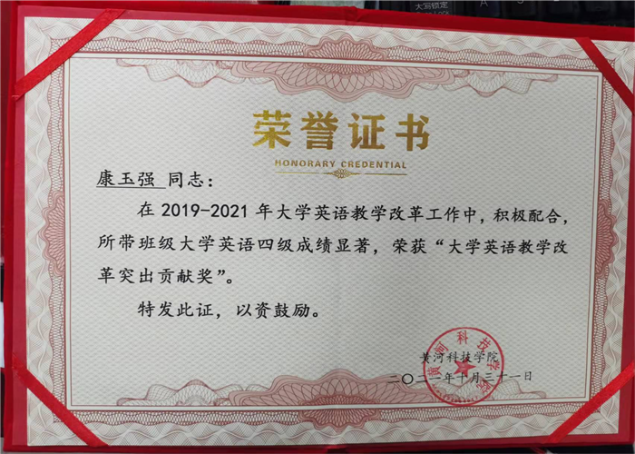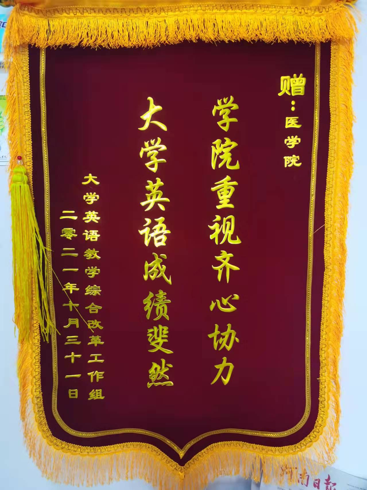 近日,医学院在2019-2021年全校英语改革工作中喜获丰收。康玉强、孙小晗、范炎峰三位老师所带班级大学英语四级成绩显著,荣获“大学英语教学改革突出贡献奖”。