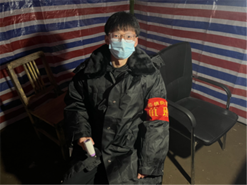 自1月8号开始,韩梦豪在韩板城村村口站岗值班,对来往车辆、人员进行登记、检查,对于重点疫区的人员进行劝返。“您好,请出示您的身份证和通行证”、“您好,请扫一下二维码,让我们看下您的近14天行程”……这些重复的话语韩梦豪每天都不厌其烦的表达着,正是这一份亲切与耐心,得到了大家的理解与配合。韩梦豪用实际行动为疫情防控做出了贡献,受到村民一致好评。韩梦豪说:“作为一名医学生,虽然现在我不能像医护人员在前线治病救人,但我也想做点力所能及的事情。为疫情防控也贡献自己的一份力量。”