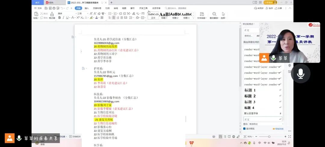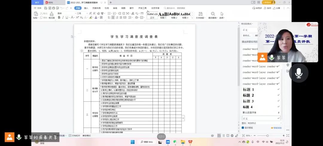 会议首先由张翠利老师讲述了学生评教的意义:间接的师生互动和交流,反映学生真实的教学需求,更好的提高教学质量与水平。她强调,要从对任课教师的授课调查、意见建议和满意度三个方面进行评教,并通过共享屏幕的方式,为同学们着手示范,有条理地教授学生评教的流程及注意事项,并对严峻疫情下的学生督导工作安排相关事务。