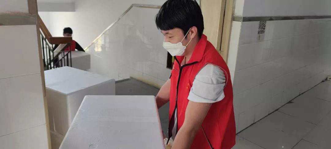 刘帅,2021级药学系,班级干部。在封寝期间,他负责老5号楼的饭菜搬运,一日三餐,还有水果和酸奶,日常生活用品。在楼下核对数量,在楼上一个个宿舍分发饭菜。封寝大家很焦虑,但是他相信看到那些丰富的物资和为疫情奋斗的人,心中一定是温暖的,疫情不会一直在,他相信,在我们一起努力下,我们终将战胜疫情。
