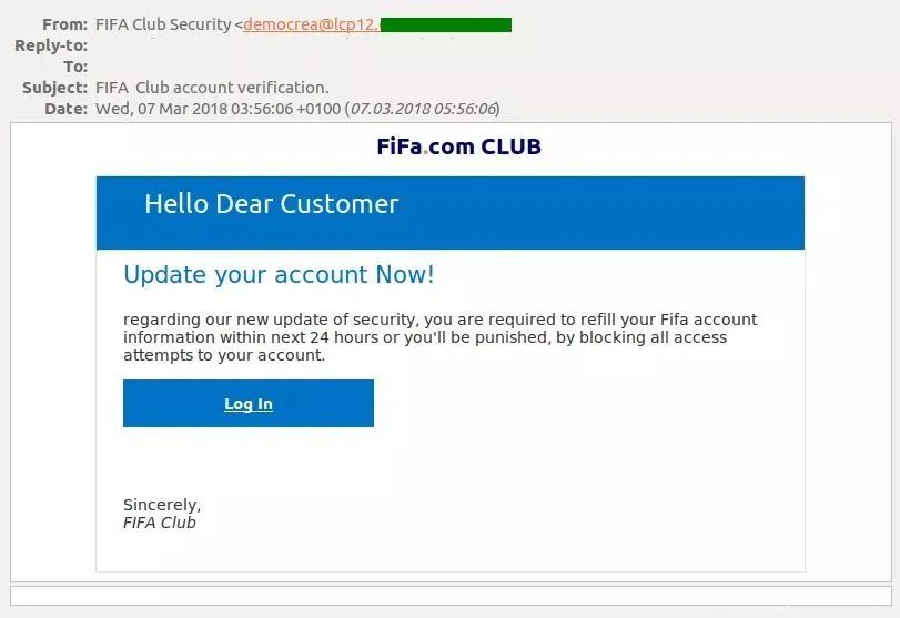 部分诈骗者通过模仿世界足联官方通知来盗取用户数据。受害者会被告知安全系统已更新,所有个人数据必须重新输入才能避免锁定。此类链接往往会将受害者带入一个伪造的个人账户,所有输入的用户数据都将直接传送给诈骗者。