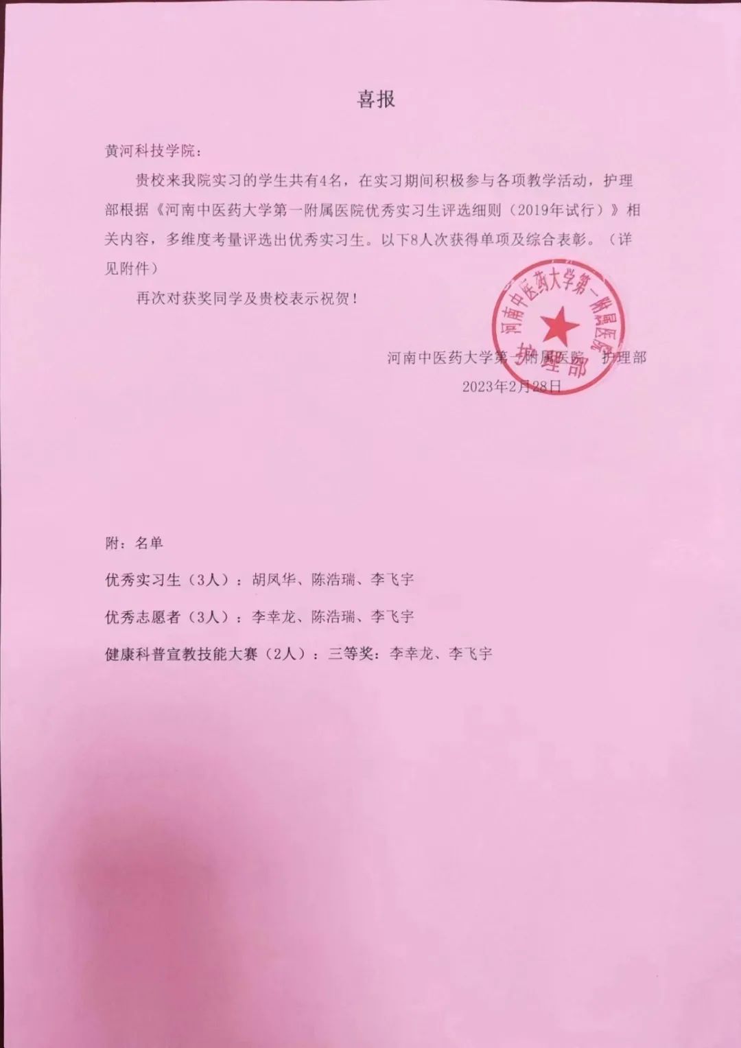 近日,河南省中医药大学第一附属医院召开2022-2023年度护理教学实习表彰大会,古天乐太阳集团城四名护理专业名列其中,实习单位(护理部)向学校发来喜报,我校四名学生在本院实习期间积极参与各项教学竞赛活动,经过多维度考核四名实习生全部获表彰,多人次获得“优秀实习生、优秀志愿者、健康科普宣教技能大赛三等奖”等荣誉,充分展示了我校学生在实习岗位上的优秀风采。