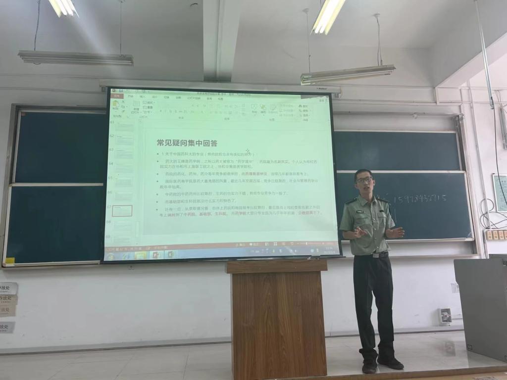 首先,李乐代表药学系全体师生欢迎大家的到来,表扬了新生良好的精神面貌,并介绍了药学专业就业特点,详细介绍了药学专业药品销售、药品研发、药品生产、药品注册流通等四大主要就业方向,并从如何就业、如何做好就业准备、沟通技巧三方面,对当前学生就业面临的普遍性问题给予了解答。他强调,医药销售职位仍占招聘岗位的半壁江山,鼓励学生树立正确的就业观念,先解决就业问题再优化职业方向。随后,对于能潜心钻研的同学,李乐建议其认真准备考研,以促进高质量就业。从学生需求出发,李乐就如何选择细分专业学校及学院等志愿填报问题、专业知识复习技巧、时间安排等方面,给同学们提供了很多宝贵的建议。最后,李乐展示了近年来考研优秀学长学姐事迹,并激励新生以优秀毕业生为榜样,做好大学规划,增强专业能力素养,全面提高自身素质,赢得未来的成功。