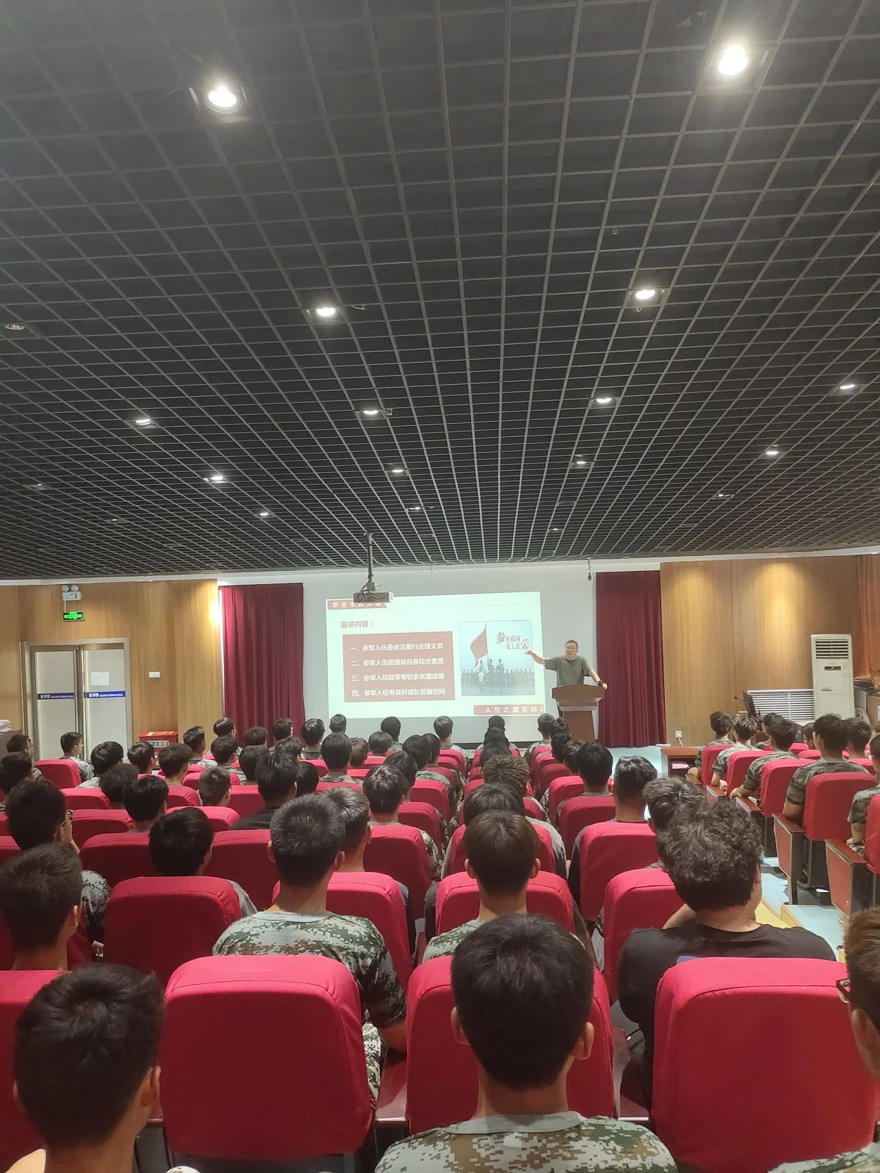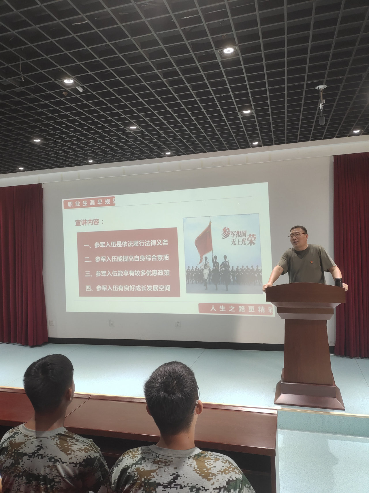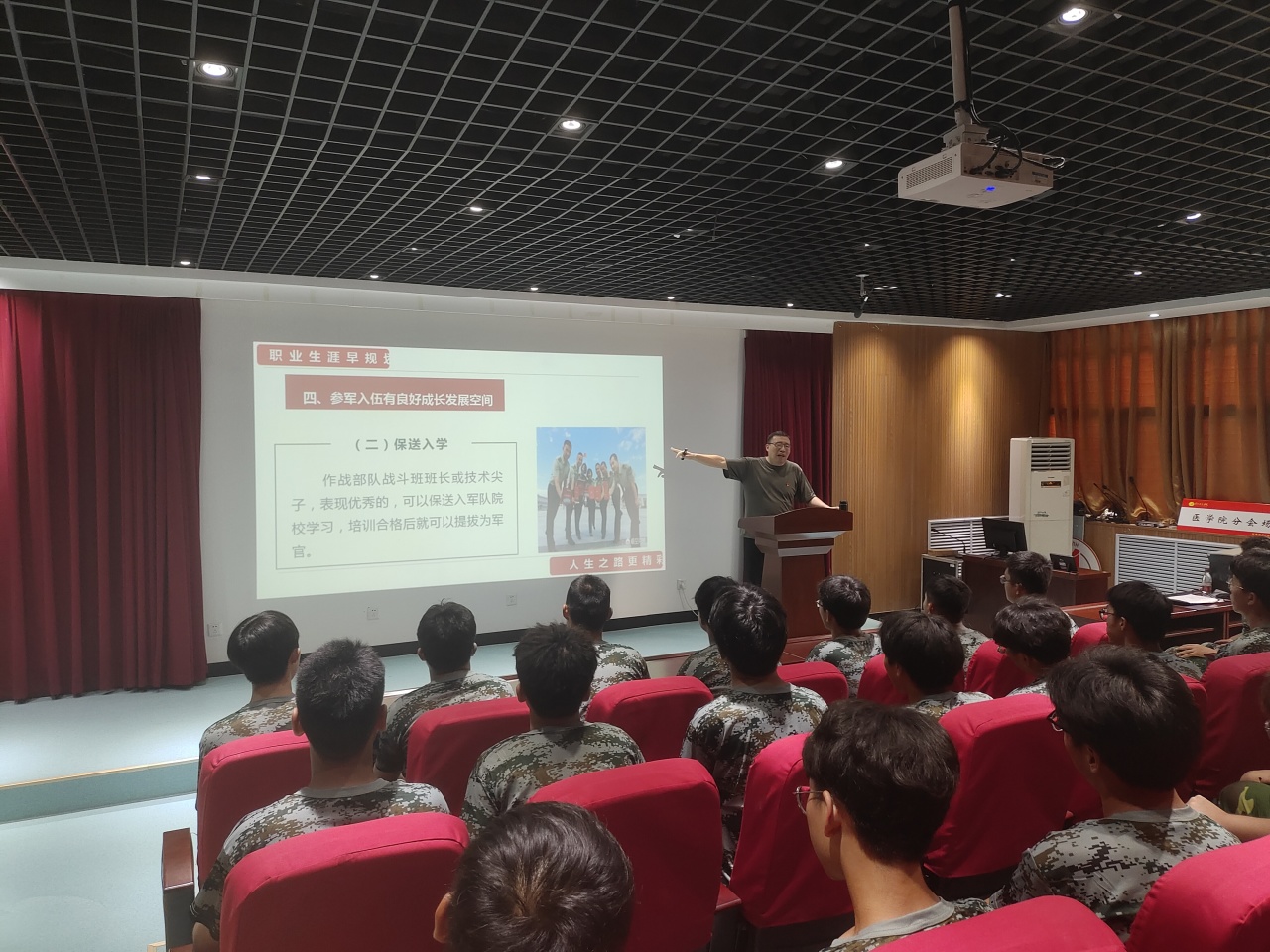 会上,韩树栋首先提出大学是立德树人、培养人才的地方,是青年人学习知识、增长才干、放飞梦想的地方,而随着就业竞争压力日渐增大,大学生需要不断通过历练提高自己,参军入伍成为大多数青年人的最佳选择。接着,韩树栋从国家需要、国内外形势以及大学生毕业入伍、征兵时间、义务兵应征入伍条件、复学、学历提升、学费及经济补偿等方面为有加入军营想法的同学们进行政策解读,激发同学们参军热情。他提出,大学生征兵入伍既是国家发展的需要,也是大学生自我成才的需要,希望同学们尽早规划职业生涯,积极响应党和政府的征兵号召,积极向国家靠拢,到部队施展才华,以军人的身份报效祖国,报答社会。同时,韩树栋分享了在军营中的历练与成长,呼吁同学们立定尚武志,投身军旅中,争做立志精忠报国、勇担历史使命的新时代大学生。最后,韩树栋就征兵工作的政治性、重要性及学校对应征入伍大学生的各项举措给同学们做了详细讲解。