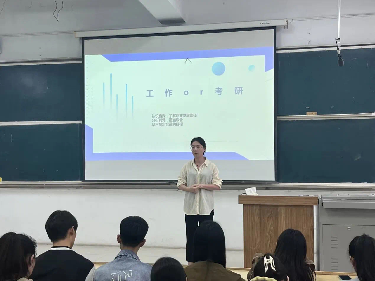 班会开始,臧漫路老师从文明上课,文明骑车停车,宿舍安全,防诈骗,离线请假,尊重生命这几个方面作出阐述,举例说明文明上课的重要性,告诉同学们要遵守学校的规章制度,共同营造一个良好的学习氛围。接着臧漫路就工作和考研这个主题,作出了详细阐述。臧漫路提到,要认清自我,充分了解职业发展的路径,然后分析其中的利弊,适当取舍,选择一条适合自己的道路,不断去提升自己,增强个人实力和发展的目的性与计划性。最后臧漫路希望同学们都能做好自己的职业规划,走出一条适合自己的道路。
