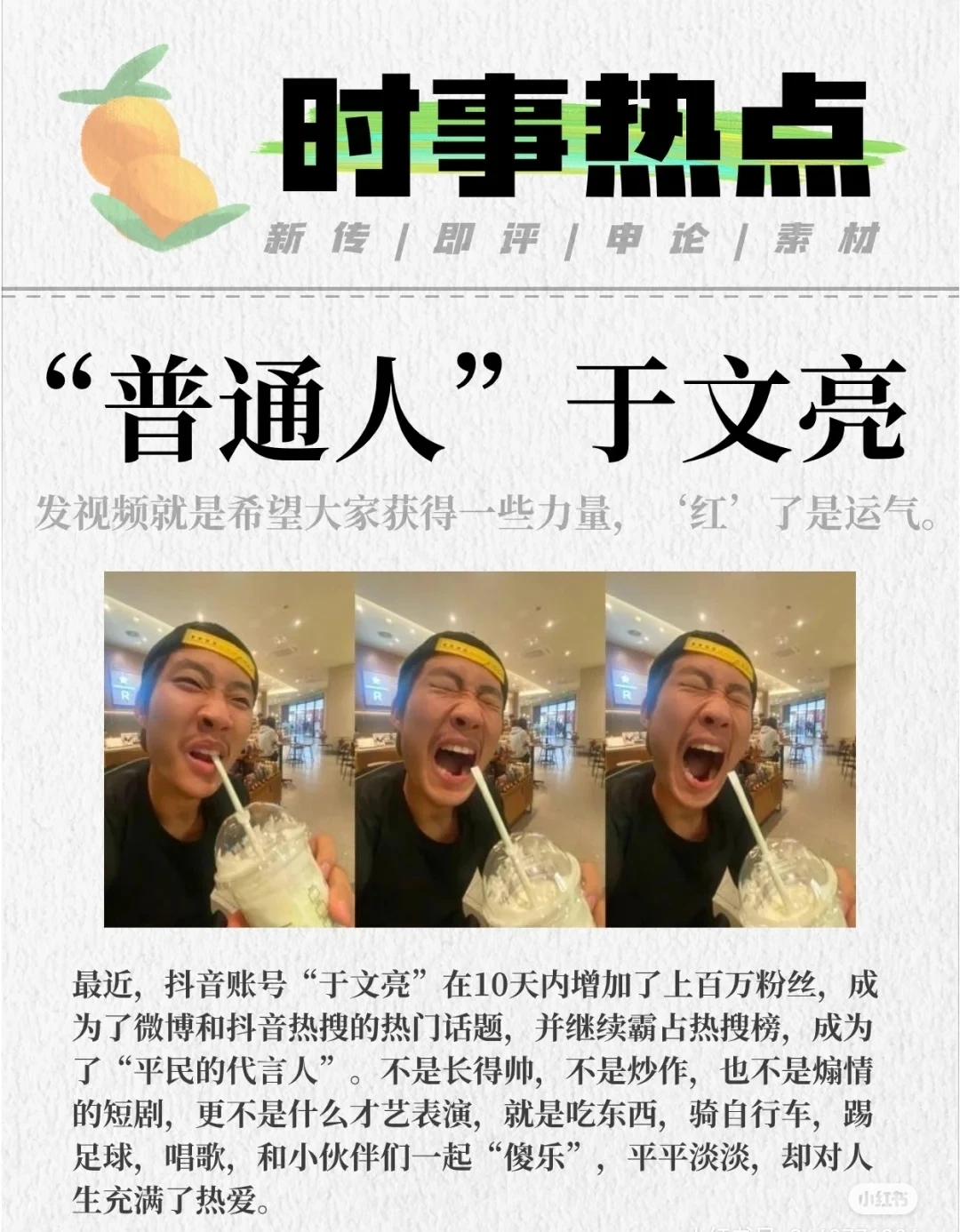 于文亮是抖音上一个比较热门的展示自己的话题,是由同名博主的记录走红的,也是网友们大胆记录自己的一个勇气话题。他积极向上、他超越了一般人的自信,他喜欢狂欢,也敢于狂欢。他不起眼,却热爱生活。他展示了成千上万人向往的勇敢状态。