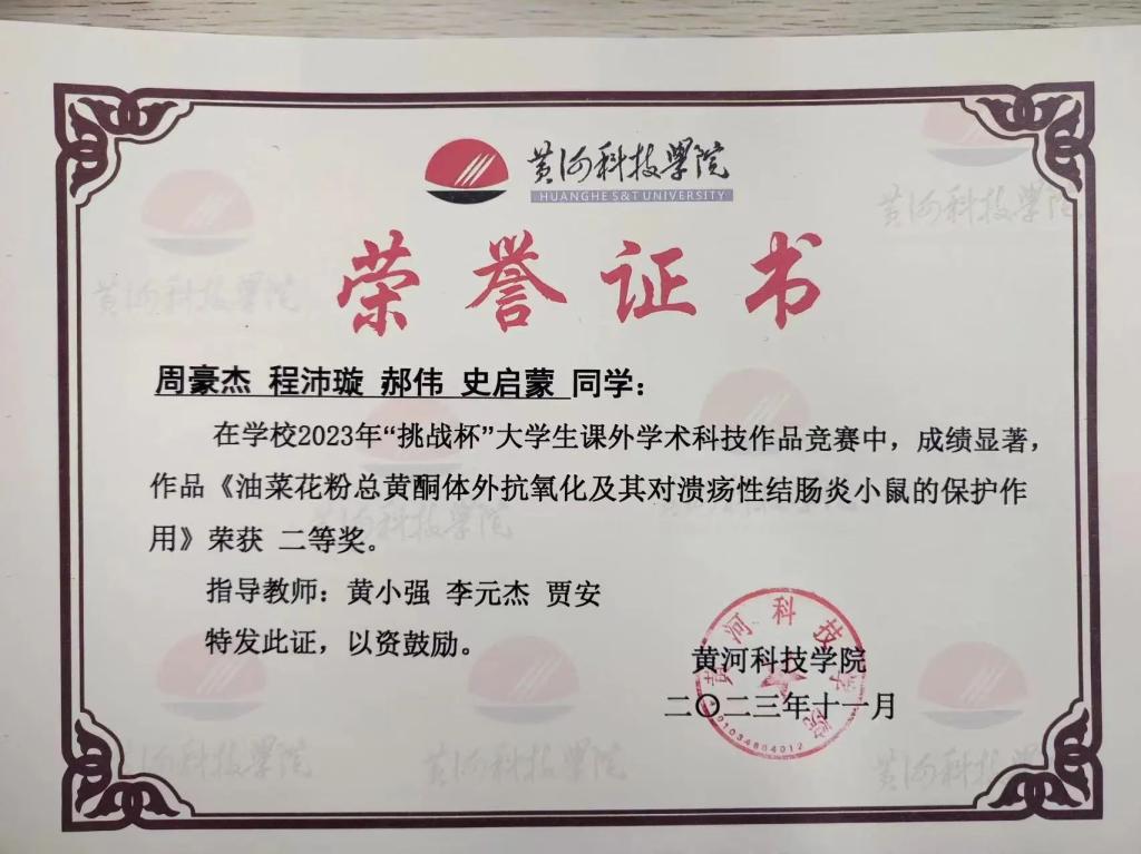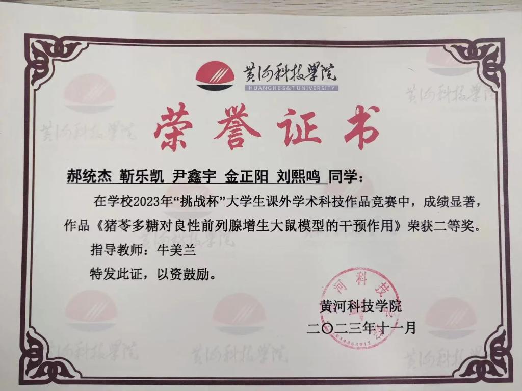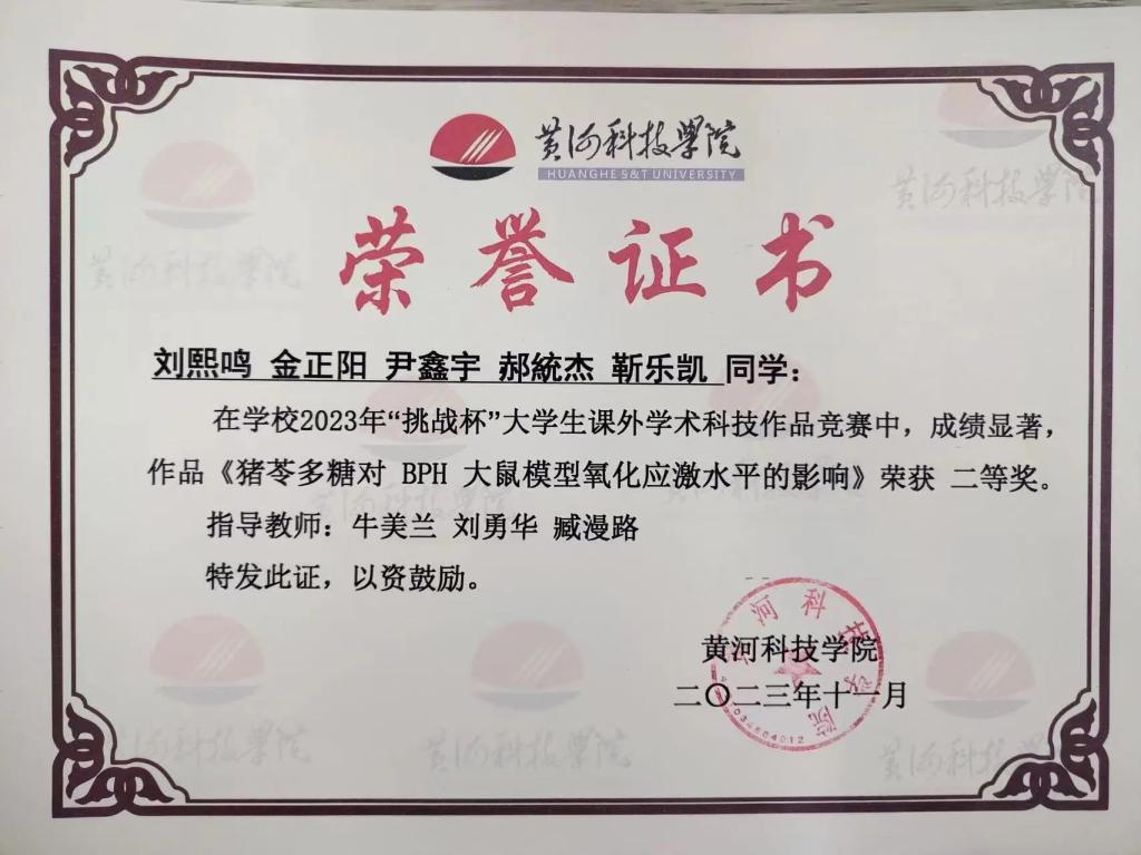 二等奖:《双孢菇对非酒精高血脂大鼠的干预作用》、《一种实验药剂定量添加装置》、《猪苓多糖对BPH大鼠模型氧化应激水平的影响》、《猪苓多糖对良性前列腺增生大鼠模型的干预作用》、《油菜花粉总黄酮体外抗氧化及其对溃疡性结肠炎小鼠的保护作用》