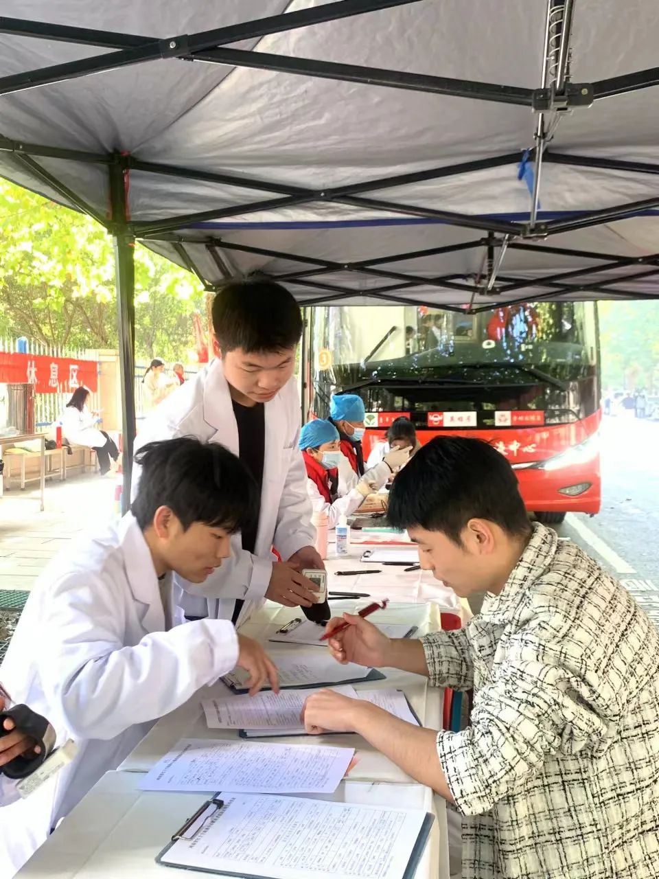 献血活动现场,参与献血的师生在医护人员及志愿者的引导下,在签到登记处进行签到、填写献血意愿征集表,进行量血压和测体重等体检工作。通过各项筛查后,符合条件的献血者依次录入个人信息,抽取血液。每一个步骤都井然有序,真正体现了“生命在接力爱心中更给力”的热烈场面。献血结束后,志愿者为献血者颁发献血证及纪念品。志愿者们纷纷表示,无偿献血活动体现了社会担当,是赠人玫瑰手有余香的好事,以后会继续保持这份热情,为生命续航,传递正能量。