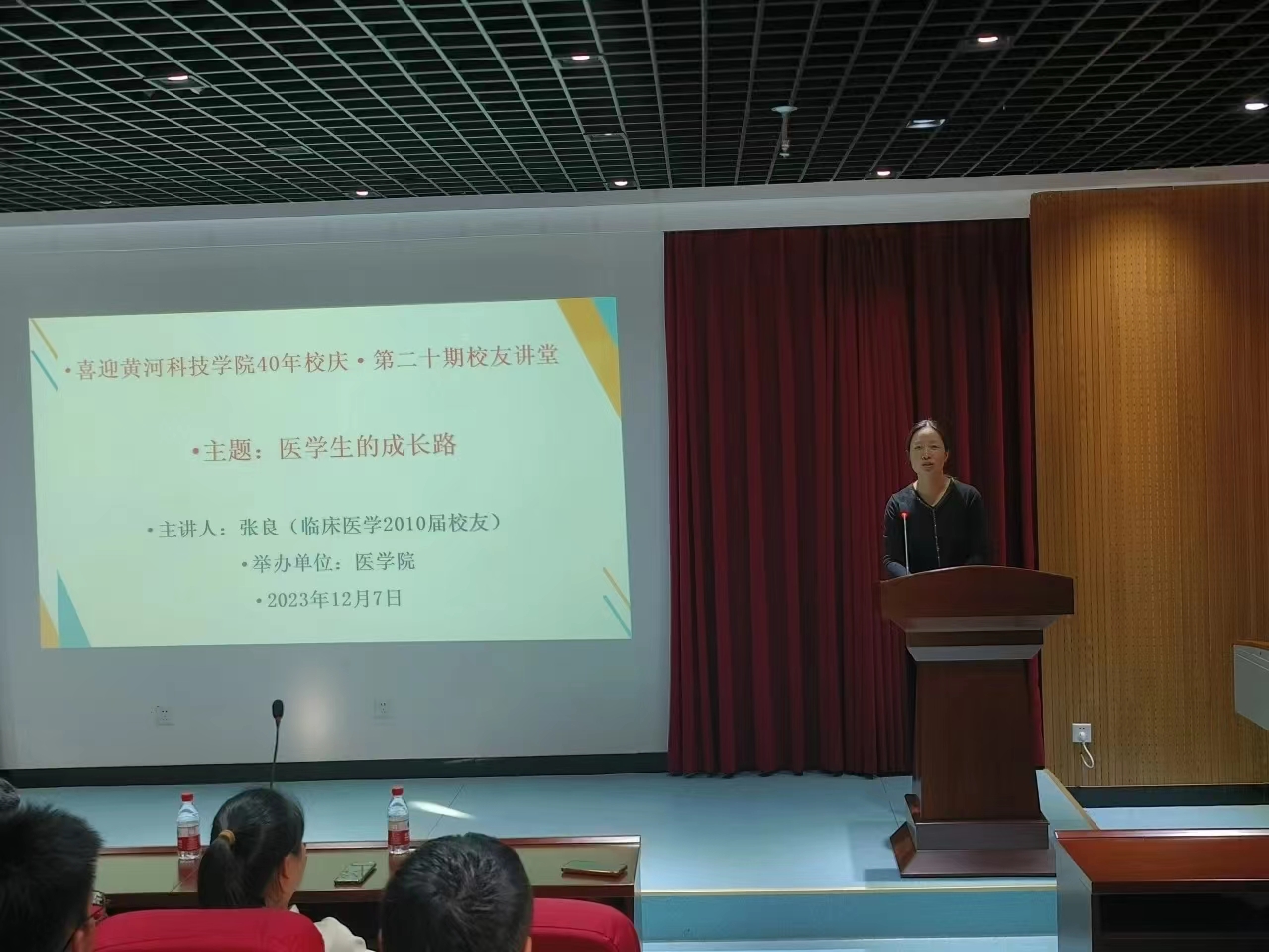 张良一行到校后首先参观了医学院人体解剖标本陈列馆,郭晓娜介绍了学校和医学院近期的发展情况,希望校友们继续关心支持学校的建设和发展,双方加强交流合作,共谋未来。张良一行深情回忆了在校期间的学习生活岁月,表示将始终秉承“开拓、拼搏、实干、奉献”的黄科大精神,立足岗位,踏实奋斗,努力奉献,以优异成绩回报母校。之后,在医学院一楼报告厅,张良受邀作题为《医学生的成长路》的专题报告