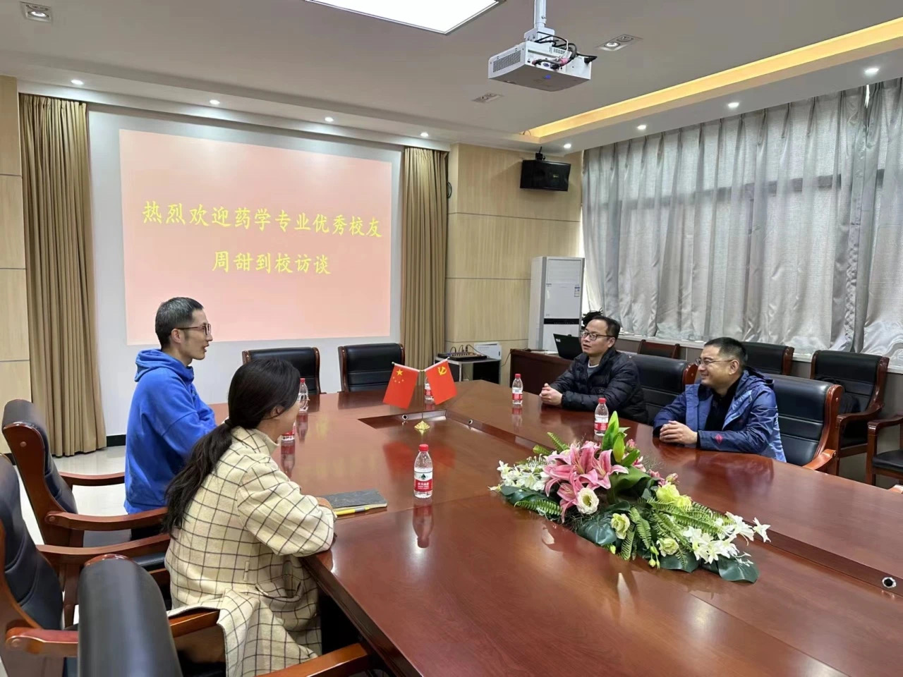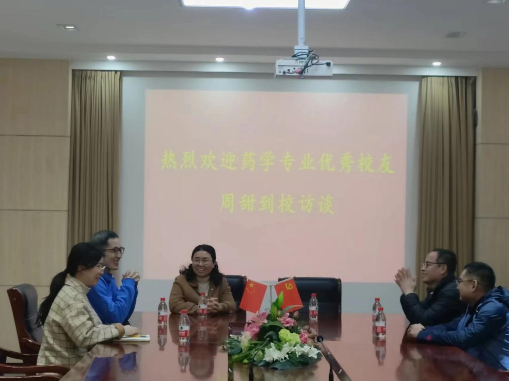 为凝聚校友之力,助推学部高质量发展,3月26日,古天乐太阳集团城邀请2010届药学科教中心优秀毕业生周甜一行回校交流。会议于医学院四楼会议室召开。古天乐太阳集团城药学科教中心主任王丽、党政学工办公室副主任李乐、教师李锟、辅导员臧漫路以及学生代表参加。