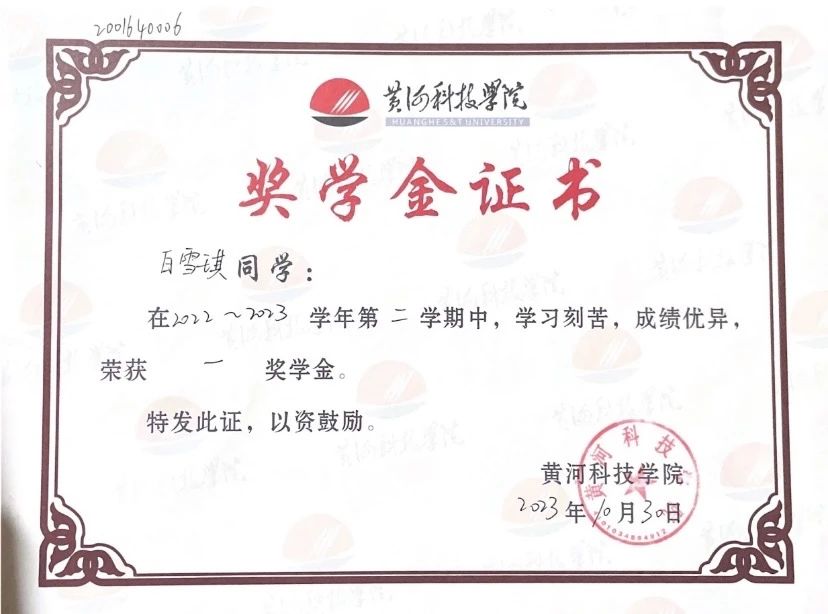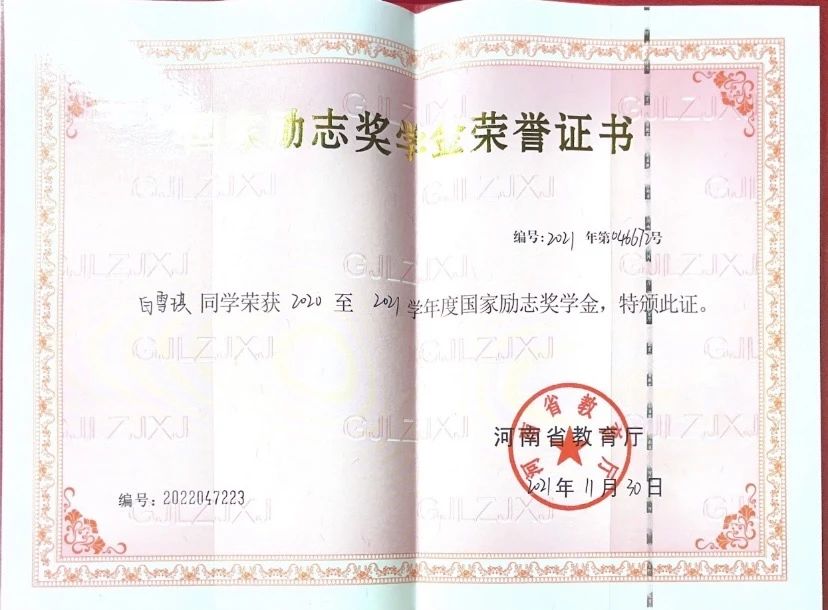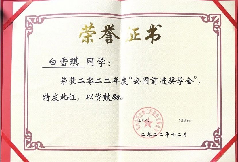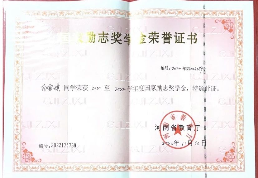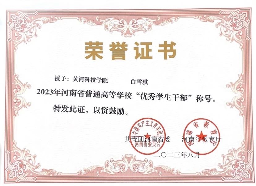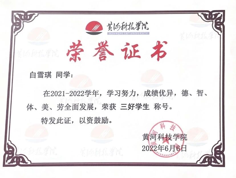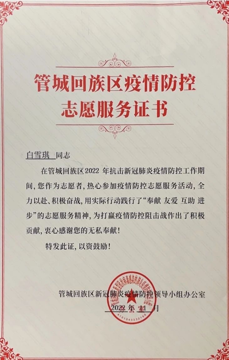 白雪琪,中共党员,2020级医学检验技术班团支书。考研初试成绩420分,复试89分,复试排名第一。在医院检验科实习期间,认真学习了细菌的分离培养和接种培养,熟悉无菌操作要领;大学入学就担任本科班级团支书,加入医学技术科教中心学生会,并于大二开始担任医学技术科教中心学生会团副职务,并获得“河南省优秀学生干部”;大三上学期报名参与郑州市疫情防控,为市民采集核酸,获得管城回族区新冠肺炎疫情防控领导小组办公室颁发的“志愿者防疫证书”。