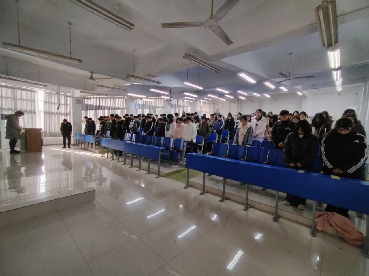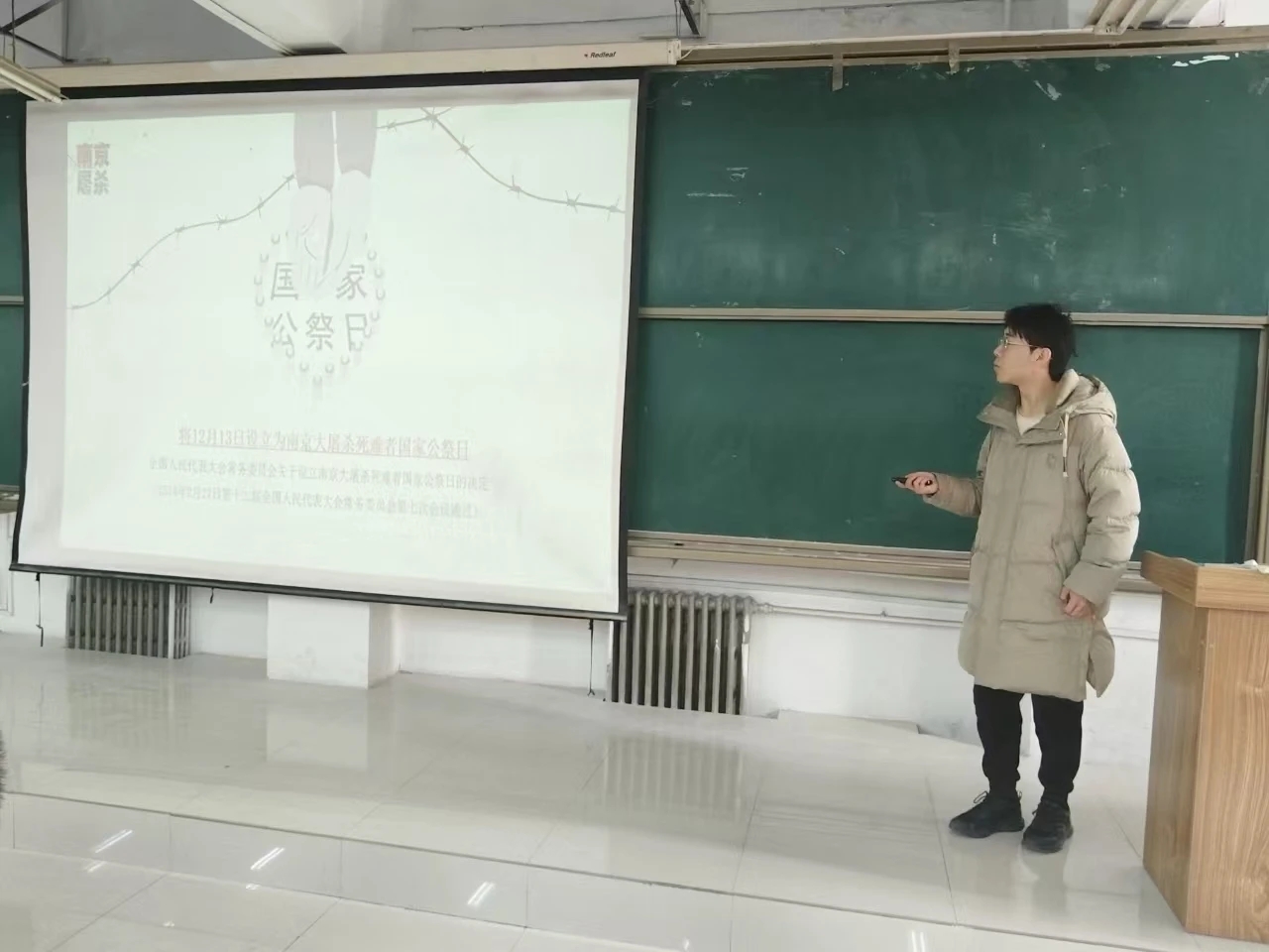 马社敏首先介绍了今天是第11个国家公祭日,强调了国家公祭日的意义。接着从国家公祭日的历史背景、罪恶行径、设置历程、公祭活动以及深远意义等方面展开。那一个个冰冷的数字,展现着往昔岁月里的山河破碎、百姓流离,侵华日军南京大屠杀等惨绝人寰的暴行直击同学们的心灵,让同学们仿佛置身于那段血雨腥风的历史场景之中。随后,入党积极分子代表闫博分享了相关历史故事以及自身感悟,他讲述了南京大屠杀中幸存者们所经历的苦难,那些泣血的记忆、不屈的抗争,无不彰显着生命在战争面前的脆弱与顽强,他呼吁同学们历史不容忘却,那些先辈们遭受的痛苦,应该成为时刻警醒的钟声,激励每一个人守护和平、强大祖国。要将这份悲痛化作学习和前进的动力,努力让祖国更加强大,这样才能避免悲剧再次上演。全体人员起立,为在战争中失去生命的同胞们默哀一分钟。最后,马社敏对本次主题活动进行总结,举办此次活动的意义在于让同学们明白,铭记历史不是为了延续仇恨,而是为了唤起对和平的向往和坚守,希望同学们能从历史中汲取智慧和力量,在今后的日子里,传承先辈们的爱国精神,用实际行动为实现中华民族伟大复兴的中国梦贡献自己的力量。