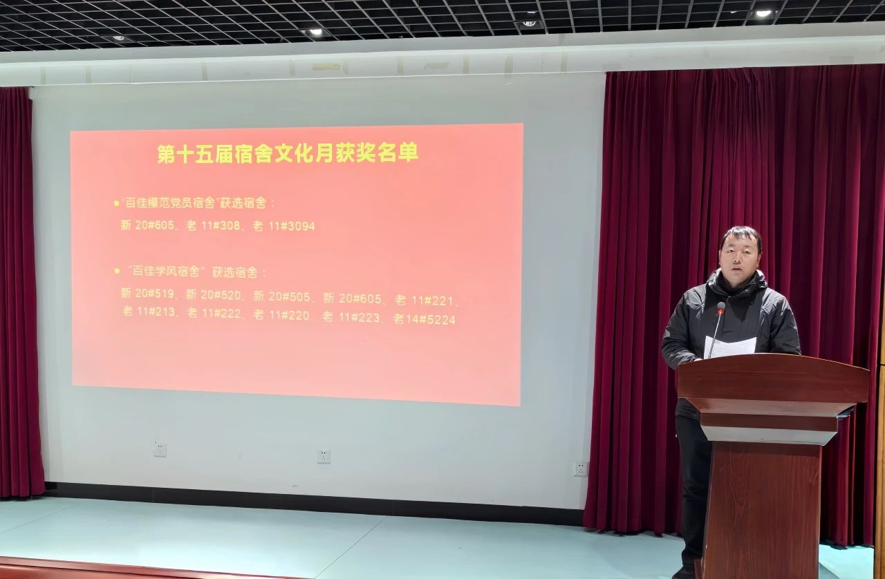 会上,康玉强宣布获奖名单,包括在宿舍安全知识竞赛、主题微视频大赛中获奖的学生代表,以及被评为“百佳模范党员宿舍”和“百佳学风宿舍”的宿舍。田恒运宣布3月至11月文明宿舍获奖名单。