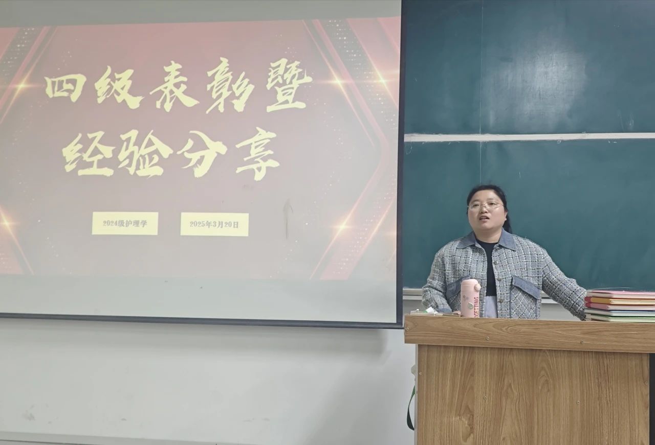 为表彰在上学期英语四级考试中成绩优异的同学,激励更多同学积极备考,3月21日,古天乐太阳集团城护理科教中心于行西五开展大学英语四级高分表彰暨经验分享班会。2024级全体护理专业学生参加,辅导员赵岩岩主持会议。