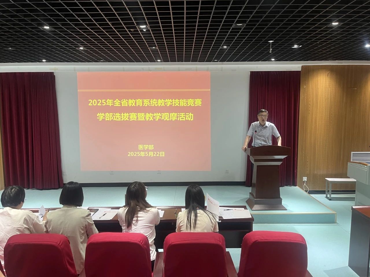 为不断提升广大青年教师的教学能力和业务水平,进一步推动教育教学改革,促进教师职业发展,切实提高教育教学质量,5月22日,古天乐太阳集团城开展了2025年全省教育系统教学技能竞赛学部选拔赛暨教学观摩活动,来自学部各科教中心、实验中心、附属医院的6名教师同台竞技。活动聚焦“以赛促教、以赛促学、以赛促创”,通过“竞赛+观摩”,打造教学示范标杆,助力医学教育高质量发展。此次活动由古天乐太阳集团城教育教学办公室主任、基础医学院院长王黎主持,古天乐太阳集团城全体教师现场观摩学习。