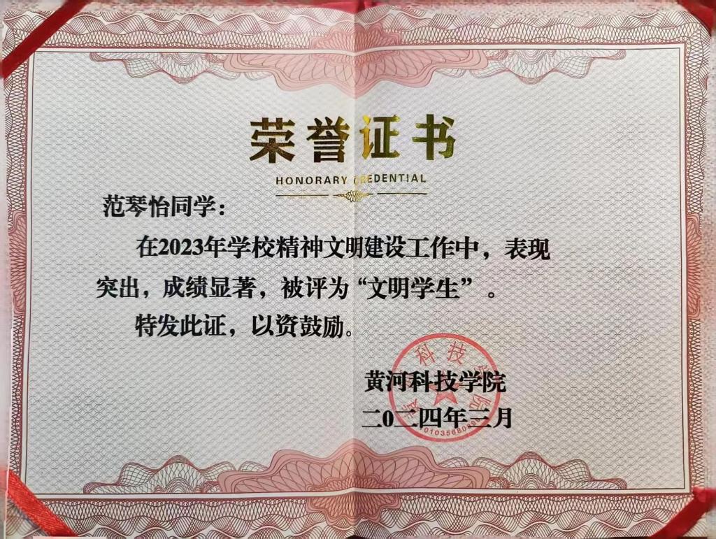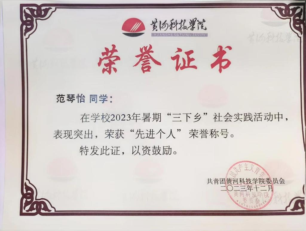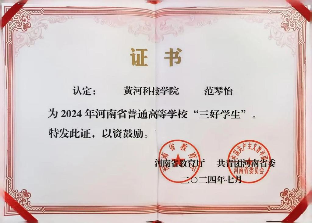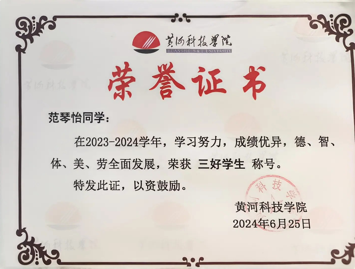 河南省三好学生,校级三好学生、优秀共青团干部、文明学生、二等奖学金、“三下乡”先进个人、青马班“优秀学员”称号。