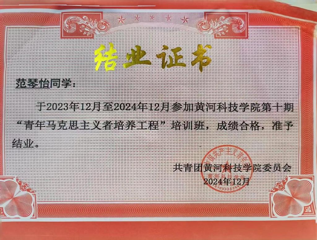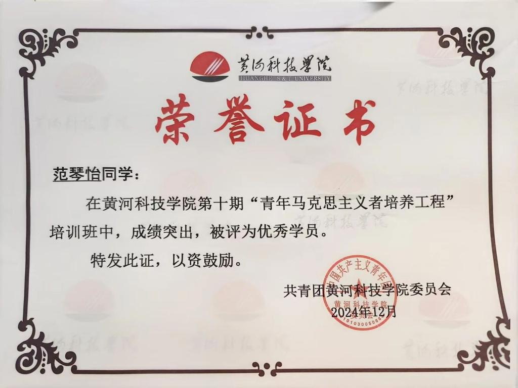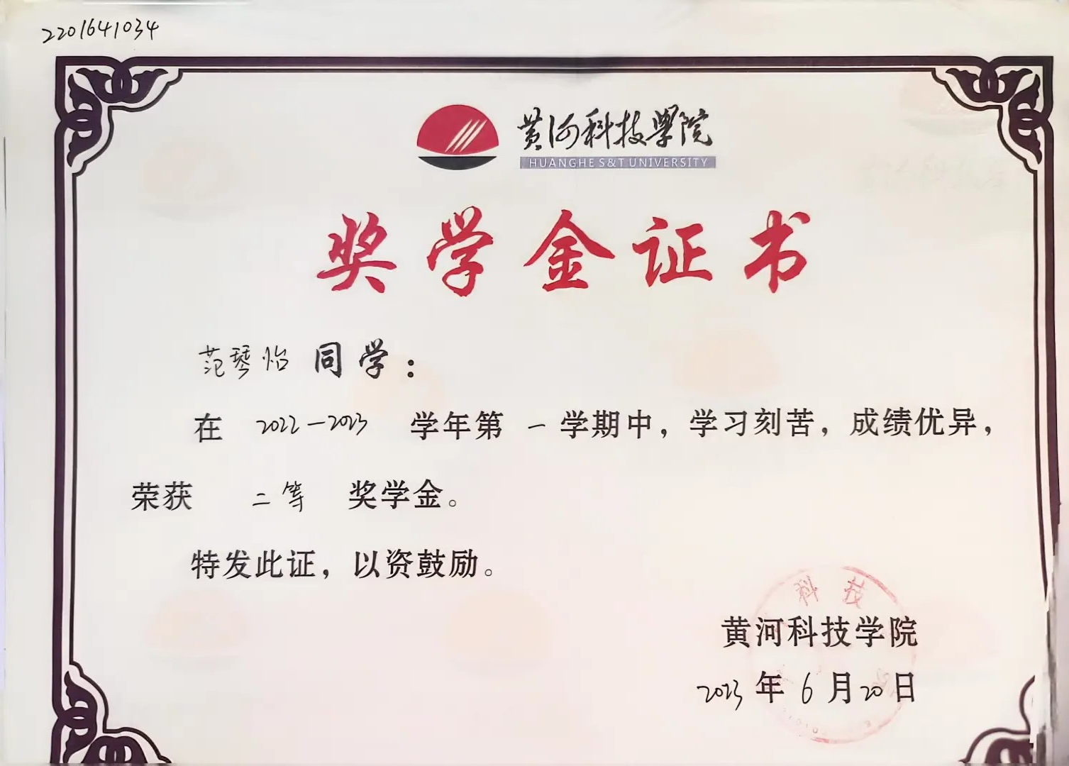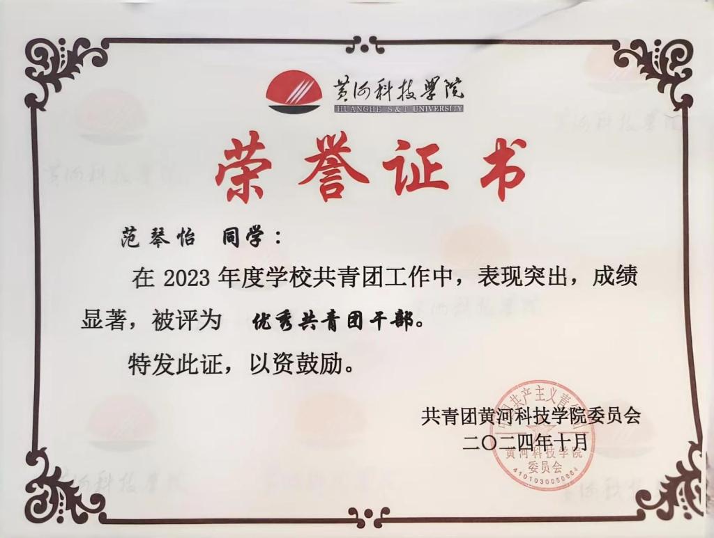 河南省三好学生,校级三好学生、优秀共青团干部、文明学生、二等奖学金、“三下乡”先进个人、青马班“优秀学员”称号。