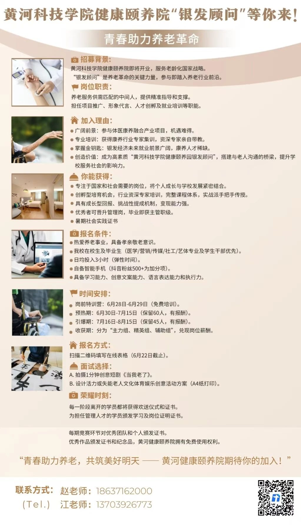 我校筹建黄河健康颐养院(一期)正式开业,是学校发展体医康养产业,服务积极应对老龄化国家战略的具体实践。“银发顾问”作为项目重要岗位,将承担项目推广、形象代言、人才创孵以及就业培训、社会实践等多种职能,也是大学生“试水”养老事业和养老产业的重要机遇。