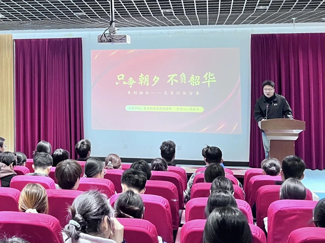 在经验分享环节,韩金卓以"只争朝夕,不负韶华"为主题,结合自身获得创新创业大赛及挑战杯省级奖项、重点培育项目等实战经验展开系统讲解,特别强调了个人努力,指导老师帮助和学校大力支持的重要性,希望同学们积极参与,共同协作,直面挫折,争取在大赛中取得优异成绩。