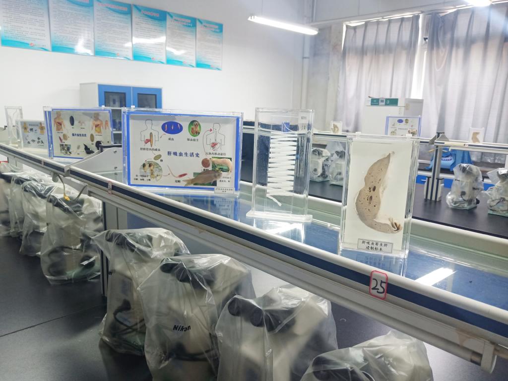 该实验室配置有多媒体教学设备、30台NIKON E100双目显微镜、倒置显微镜、厌氧培养箱、高速离心机等设备;还储备有大体标本、针插标本和玻片标本1200件余件。实验室的大体标本与临床常见寄生虫病的致病机制和症状密切相关。比如蛔虫感染肠梗阻标本、血吸虫寄生肠系膜标本、蛔虫寄生于胆道标本、钩虫咬附肠壁浸制标本等,玻片标本囊括了寄生虫所有的纲目,包括常见的线虫纲,丝虫纲,绦虫纲,孢子虫纲等。